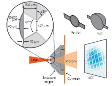 圖1 實驗設置和目標靶。錐靶由10微米厚的球殼層和鋁錐體組成,銅網格和成像板分別放置在距離球麵頂點1.5毫米和4厘米處