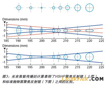 該實驗對象是傾斜的有機玻璃,目的是來看看在成90度的焊接(功率為5kW,速度為20m/min)中的光束特性的差異。光束焦散是沿著垂直的Z軸傳播(圖3):若是標準拋物麵聚焦反射鏡,光束截麵基本保持圓形;若是高速大功率(HSHP)聚焦反射鏡,z-x和z-y平麵的光束截麵是不同的。