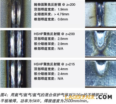 用氦氣/氬氣/氫氣的混合保護氣體對3/16in的不鏽鋼進行平板堆焊,功率為5kW,焊接速度為2500mm/min,標準拋物麵聚焦反射鏡具有高的功率密度,帶來的是更高的熔深,而代價是高的焊縫缺陷幾率(圖4上)。用HSHP聚焦反射鏡會帶來更寬的頂部焊道和更大的FUZ,從而提高熔融效率。若是熔深的要求低於2.9mm,HSHP聚焦反射鏡在相同的FUZ寬度下將帶來更高的速度(圖4中)。在2.4mm熔深要求下做實驗,HSHP聚焦反射鏡可以實現全功率的全速焊接(圖4下)。