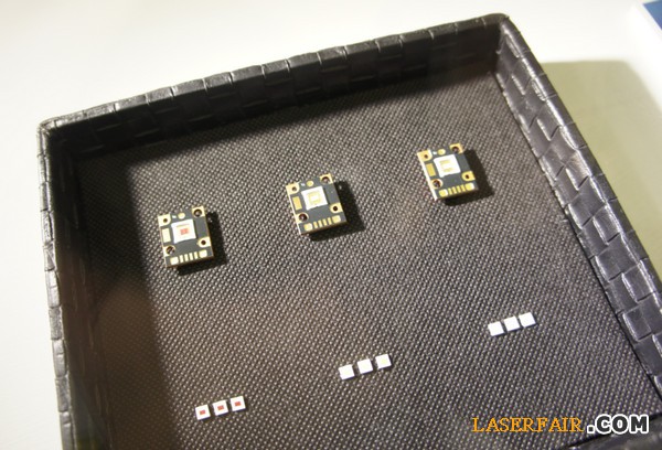 晶電 RGB 三色投影機用晶片產(chan) 品。此產(chan) 品與(yu) LED 封裝廠葳天科技合作,封裝采用單晶與(yu) 雙晶兩(liang) 種方式。