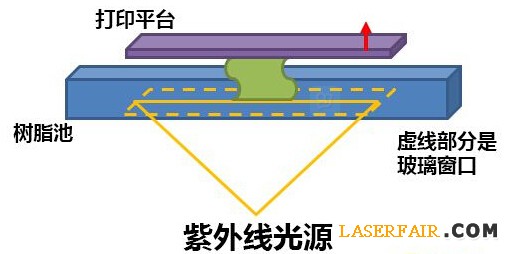 我們先對SLA技術的成型過程有一個簡單的概念。SLA 3D打印機的樹脂池底部有一個透光的窗口,通常是玻璃材質。打印平台下降貼近窗口,中間的縫隙充滿液態的樹脂。紫外線透過玻璃照射樹脂,使很薄的一層樹脂快速聚合成為固體。
