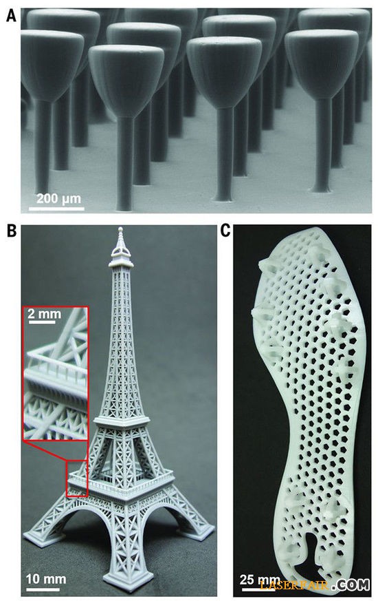 50微米直徑的小物體(上)、10厘米高的埃菲爾鐵塔(左)和20厘米的鞋托(右)