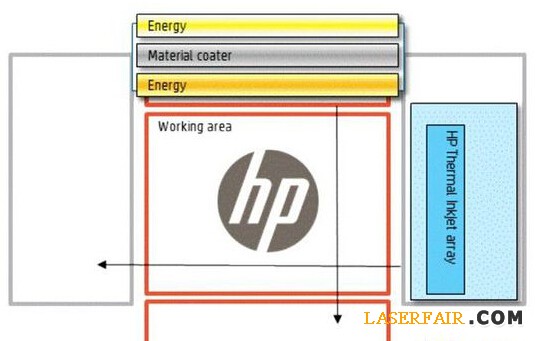 惠普Multi Jet Fusion 3D打印機頂視圖示意 上方的材料噴頭和右側的墨水噴頭都可以
