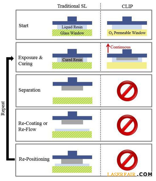 傳統光固化技術與CLIP的差距就在於停頓和重啟的過程而CLIP是連續打印的
