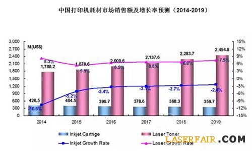 據報道,2014年中國打印機耗材總出貨量接近1.16億(yi) 支。其中,噴墨耗材5933.5萬(wan) 支,環比2013年下降了8.7%,銷售額為(wei) 4.26億(yi) 美