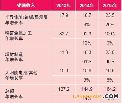 表2展示了工業(ye) 激光器在材料加工應用領域的情況。本刊使用了由我們(men) 的合作夥(huo) 伴Strategies Unlimited公司建立的類別,其中材料微加工領域包括了所有激光功率小於(yu) 1千瓦的應用,而材料加工領域則覆蓋了激光功率大於(yu) 等於(yu) 1千瓦的應用。本刊沒有發布應用於(yu) 遠紫外和極端遠紫外光刻領域的激光器的銷售收入。根據Strategies Unlimi ted的報告,這一領域的銷售收入為(wei) 9.08億(yi) 美金, 比2013 年增加了15%,並且預計在2015年將獲得18%的增長率。一些國際市場報告在其工業(ye) 材料激光加工的報告中也囊括了這項應用。