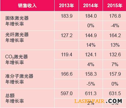 另一方麵來說,來自其他領域的發展為(wei) 市場的整體(ti) 銷售收入增長添磚加瓦。光纖激光器預計將達到兩(liang) 位數的增長率(13%),高功率二極管激光器在汽車工業(ye) 的收獲將超過2014年。
