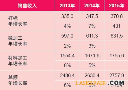 表4將微加工分為三個大的分類以及雜項,從表中我們能看到半導體工業(一個典型的周期性行業)的設備訂單下滑帶來的影響。再加上精密金屬加工這個主要行業的不確定性,導致2014年的銷售收入下降了2%。不過積極的一麵是,3D打印技術煥發出極大的活力,引起了持續而廣泛的關注。這提高了眾多工業對增材製造(用高功率激光直接金屬沉積技術來製造零部件)的接受度。最終在這一領域的激光器銷售收入增加了34%,並且在2015年還會有更大的增長潛力,預期增長率將達到62%。