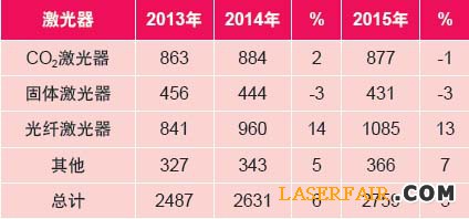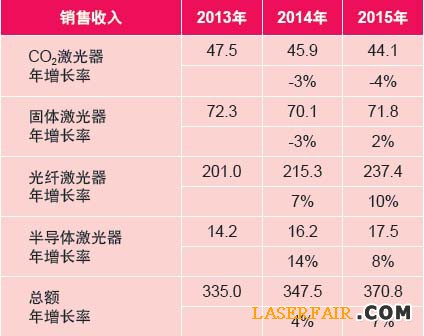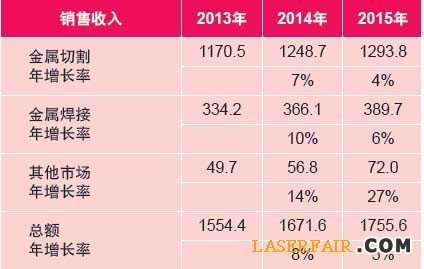 不考慮2014年全球製造業的增長,在光纖激光器產銷兩旺的勢頭的推動下,工業激光器的銷售同比2013年平均增加了6%。在表1中,我們根據領先的供應商在2014年初發表的年度業績報告,而對2013年的總銷售數字進行了調整。