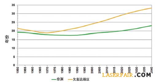 各種數據顯示,非洲實際的工業化前景,是比Rodrik的結論更樂觀一些的。一方麵,人口數量是非洲一個很強的競爭優勢。圖2顯示了非洲以及廣闊的欠發達地區的人口平均年齡曲線。非洲人口的年齡優勢正在顯現,全球製造商不應對此視而不見。年輕人已經形成了以家庭為單位的重要基礎,帶動了眾多商品需求,具有積極意義。年輕一代對製造業領域的勞動力發展,也構成了關鍵的一環。