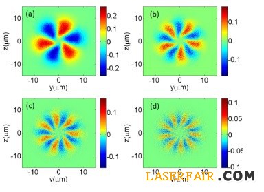 第3、5、7、9階諧波的電場分布圖。可以清晰看出渦旋光的荷數(角量子數)隨諧波次數增加而增加。