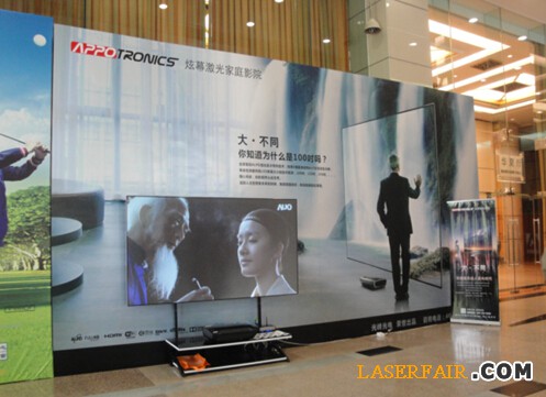 此次展示的國產激光電視是第一次在家用渠道正式亮相,全新的激光電視依然是采用流線型設計和超薄的分體設計,亮度為300 nit,亮度提升70%,色彩飽和度高,灰階豐富,對比度達到1,000,000:1, 全高清的色域,超強的抗環境光能力,即使在明亮的展會燈光下,畫麵也依然靚麗如新,使用六層玄烏冷屏,屏幕不通電,主機的功耗僅為200瓦,節能環保,不刺激眼睛,倡導健康綠色生活。同時該激光電視具備3D功能,而且3D的亮度,色彩,清晰度及出屏感都極強。該激光電視自帶4K解碼,4K片源可直接通過USD口讀取。超高清的顯示效果,實現你擁有私人家庭影院的夢想。