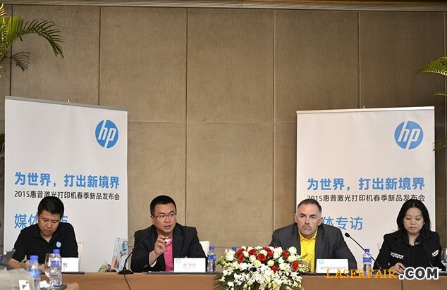 左起:惠普打印與信息產品集團中國區激光打印產品經理 劉智、中國惠普有限公司副總裁、打印機與耗材產品事業部總經理 金衛東、惠普全球副總裁、激光打印硬件與企業解決方案事業部總經理 Jim Nottingham