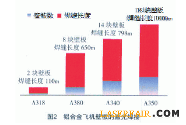 鋁合金是航空航天結構重要的金屬結構材料,因此在日本、美國、英國、德國等發達國家十分重視鋁合金激光焊接技術研究。英國焊接研究所成功地運用4kW的Nd:YAG激光填絲焊進行了AA2014鋁合金帶筋壁板的雙光束YAG激光焊接,采用直徑為1.2mm的ER2319 鋁合金焊絲焊絲,焊接接頭質量良好,焊接變形小於TIG 焊。Gobbi等研究飛機機翼下的鋁合金油箱的CO2激光焊,接頭氣孔嚴重,采用YAG激光焊可獲得優質的焊接接頭。空中客車公司與BIAS、Fraunhofer等研究所合作,經10年努力於2003年在德國和法國空中客車部件生產廠實現了A318客機鋁合金下壁板結構雙光束CO2 激光填絲焊以及YAG激光填絲焊,焊接速度為4~10m/min,這種以焊代鉚結構將減輕飛機的近20%機身重量,降低製造成本約20%,已應用在A318、A380和A340係列飛機的壁板結構焊接中,如圖2所示。未來還將應用於A350飛機壁板焊接,壁板數量將達到18塊,焊縫總長度將達到1000m。隨著光纖激光焊接技術的發展,目前先進國家的航空製造領域已將光纖激光焊接和激光電弧複合焊接技術列為鋁合金焊接技術的重點,尤其是厚板焊接和異種金屬的焊接,如美國NALI項目針對民機和JSF飛機發動機燃燒室結構正在開展光纖激光焊接和激光電弧複合焊接技術的研究。