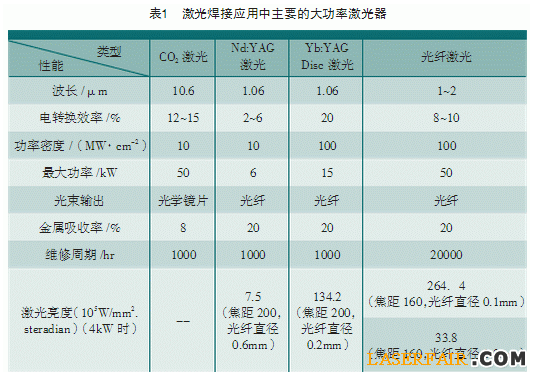 激光焊接是將高強度激光輻射至金屬表麵,通過激光與金屬間熱力耦合作用使金屬熔化再冷卻結晶形成焊縫的技術。根據激光焊接的熱作用機製可分為熱導焊和深熔焊兩種,前者主要應用於精密零件的封裝焊接或微納焊接;後者在焊接過程中往往產生類似於電子束焊接的小孔效應,形成深寬比較大的焊縫。激光深熔焊接實現需要的激光功率高,該技術目前應用於激光深熔焊接的大功率激光主要有4種類型,其特點如表1所示。