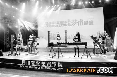 記者日前在四川文化藝術學院采訪中獲悉,該院音樂技術研究所創建了由多種激光樂器組成的全球第一支MIDI激光樂隊。演奏者僅需觸碰感應激光,便可完成多種樂器的演奏功能。MIDI激光樂隊“成員”包括MIDI激光梯、MIDI激光馬林巴、MIDI激光德朗、MIDI激光萬音輪和MIDI鼓樂器。樂隊創建人之一、學院藝術總監林海介紹,樂器能根據樂曲配器的需求,設置不同樂器的聲音,可演奏出海量的音色與聲效,完成民樂、西洋樂、打擊樂等各類樂器的演奏功能。圖為MIDI激光樂隊在演奏中。