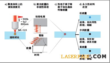 飛秒激光微加工由一種叫做“激光感應光學擊穿”的現象引起。在這一過程中,飛秒激光器的光學能量被輸送到加工過的材料上,激發出很多電子,促使電子離子化,並將能量向晶體運輸。隨後,材料發生結構變化或相位交替,造成折射率永久性改變,甚至在焦點處留下一個孔。