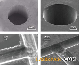 圖1:使用納秒激光器(左圖)和使用近紅外(NIR)飛秒激光器(右圖)對玻璃進行激光加工示例。
