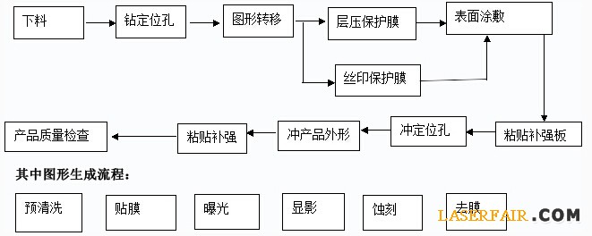 FPC線路板主要分為單麵和雙麵及多層線路板,雙麵線路板是從單麵板發展起來的產品,單麵FPC板的生產流程如下: