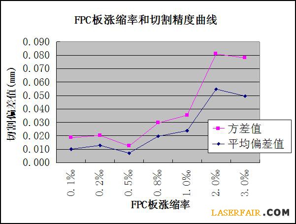 FPC板漲縮率和切割精度曲線圖表明,當漲縮率小於0.8‰,切割精度在±0.05mm範圍內波動。隨著漲縮率的增大,平均切割偏差值和方差值都增加,當漲縮率大於0.8‰時,切割精度達不到±0.05mm的客戶要求。