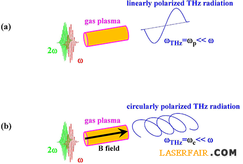 圖1:示意圖。(a)原始雙色激光方案:離化電流驅動等離子體本征振蕩,使得產生的太赫茲波頻率為等離子體頻率ωp、線偏振態、單周期波形;(b)磁場控製的雙色激光方案:等離子體電子在外加磁場作用下做近回旋運動,使得產生的太赫茲波頻率為電子回旋頻率ωc、圓偏振態、多周期波形。