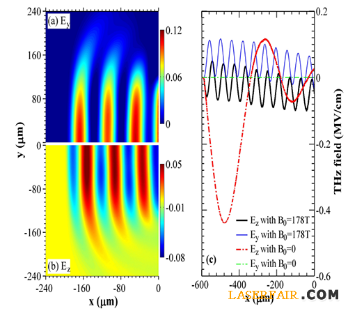 圖2:KLAPS粒子模擬結果。[(a), (b)]產生的太赫茲波的兩個電場分量Ey和Ez在某時刻的空間分布圖,(c)為電場在軸心處的分布圖,其中外加磁場強度為178特斯拉(對應的電子回旋頻率為5THz)。作為對比,在(c)圖用兩條虛線給出了無外加磁場時產生的太赫茲波的兩個電場分量。結果顯示外加磁場使得原來的頻率為1THz、單周期、線偏振(僅Ez分量)的太赫茲波,變成頻率為5THz、多周期、圓偏振的太赫茲波。