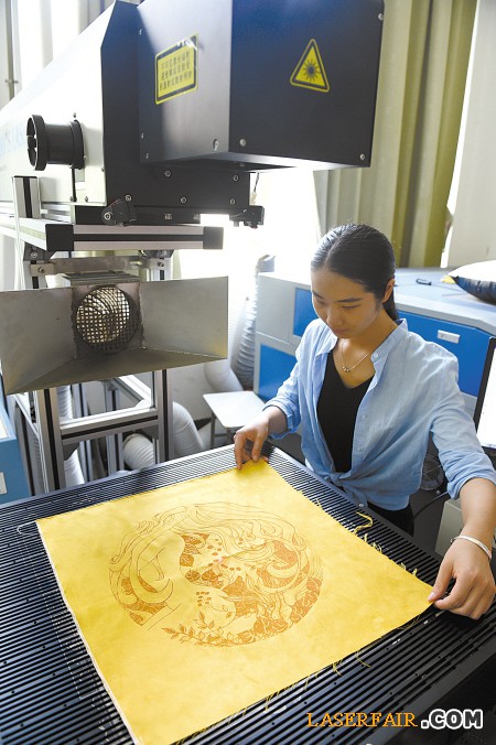 圖為(wei) 激光雕刻現場。 布料上做花型,不外乎印花、提花、繡花,可是現在浙江紡織服裝職業(ye) 技術學院紡織學院的學生們(men) 卻來了個(ge) 創