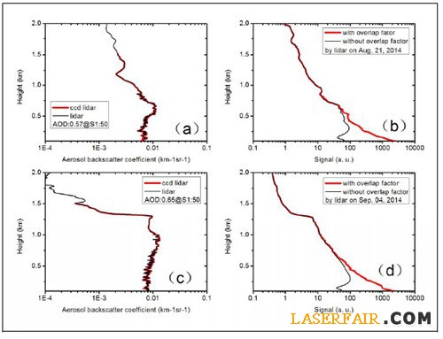 後向散射係數廓線以及相應的幾何因子校正前(黑線)後(紅線)的米散射回波