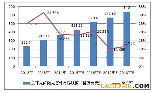 2012---2018年全球光纖激光器器件市場規模(單位:百萬美元)