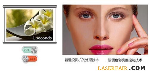 激光投影機由於采用的激光冷光源,具有即開即亮的特點;由於光源的色域廣及低衰減特性使得其輸出的畫質長期保持較高的亮度、色彩飽和度和對比度,使得畫麵色彩始終亮麗如新。