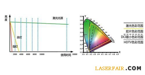 激光光源由於使用純度非常高的紅、綠、藍三原色光源,能實現遠遠大於傳統NTSC或DCI最小色彩範圍的色彩空間,能展現大部分人眼可以識別的色彩。而無論采取哪種白場色度標準,對於紅、綠、藍三原色可以分別精確控製的激光光源避免了濾色器導致的光利用效率降低,色度控製不靈活的問題。