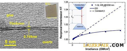 研究小組張賽鋒等人與愛爾蘭都柏林聖三一大學合作,觀測到1-3層WS2薄膜的近紅外簡並雙光子吸收及其飽和效應,通過控製單層數量,實現了WS2和MoS2寡層薄膜非線性特性的調控工程,通過改變波長調控寡層半導體中共振態和非共振態雙光子吸收以及飽和吸收的“開-關”操作,為禁帶寬帶大於光子能量的二維半導體的鎖模和調Q特性提出了一種物理機理。相關論文已被ACS Nano雜誌(影響因子12.881)在線出版。