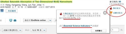 此外,課題組2013年ACS Nano論文[K. Wang, et al. ACS Nano, 7, 9260 (2013)]被Web of Science (SCI)基本科學指標(Essential Science Indicators)評為熱點論文(Hot paper,即收錄2年內SCI引用次數居同領域論文前0.1%的論文)和高引用率論文(Highly cited paper,即收錄10年內SCI引用次數居同領域前1%的論文)。