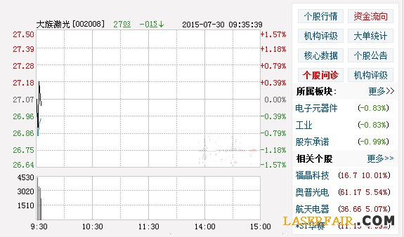 昨日大族激光開盤報25.72元,截止收盤,該股漲7.04%報27.07元,當日振幅為(wei) 12.57%,換手4.46%,成交金額為(wei) 10.96億(yi) 元。5日內(nei) 跌幅
