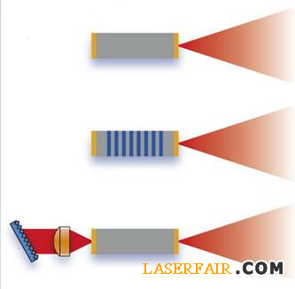 QC激光器的基本結構包括FP-QCL(上圖)、DFB-QCL(中圖)和ECqcL(下圖)。增益介質顯示為灰色,波長