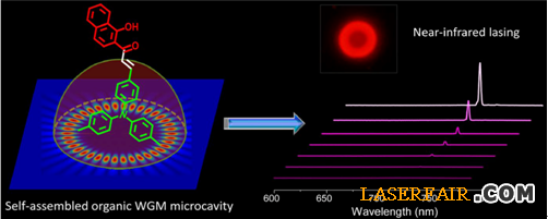 最近,研究人員通過把“分子內氫鍵”引入有機共軛小分子的策略,合成了固體發光量子效率高達15.2%的近紅外發光材料?查耳酮衍生物DPHP。由於DPHP的雙親性質,用溶液自組裝方法自下而上構築了有機微米半球的回音壁諧振腔。與此同時,DPHP材料自身超快的輻射速率,避免了在高強度泵浦光下的激子-激子湮滅現象,使得DPHP材料發出的近紅外熒光在回音壁腔中實現了光的受激發大,這也是基於非摻雜型有機固體近紅外激光的首例報道(J. Am. Chem. Soc. 2015, DOI:10.1021/jacs.5b03051)。文章在線發表後,美國《化學與工程新聞》(C&EN)周刊網站,以題為“Organic Lasers Shine Bright in the Infrared”對此工作進行了相關報道並且給予了高度評價:“Easy-to-build hemispheres could prove widely useful for lasing applications”。https://cen.acs.org/articles/93/web/2015/07/Organic-Lasers-Shine-Bright-Infrared.html