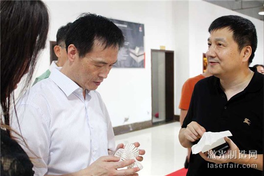 隨後,胡書記還饒有興趣地參觀了金運3D打印互動牆、意造出品的各種3D打印產品、以及自主研發的桌麵級3D打印機,並對公司在3D打印業務開展以來所取得的成績和行業領導地位表示讚賞。此外,還參觀了公司的激光智能加工設備,在一款麵料雕花機麵前,胡書記停下腳步,仔細詢問它是怎樣將惟妙惟肖花紋“印”到麵料上,市場銷量如何,產能多大、有無汙染,當得知它是通過物理高溫氣化成型,個性化加工,毫無汙染,,並且市場需求旺盛時,胡書記感歎,在未來的定製化時代,這種類型的個性化環保型產品,必將取代傳統的高能耗高汙染加工方式,個性化的激光加工還是大有可為的。