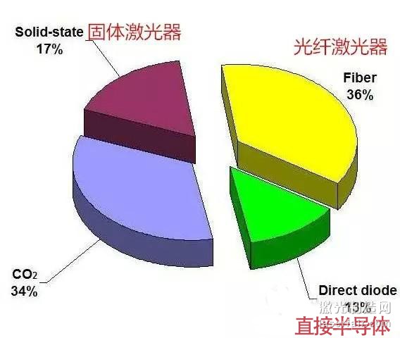 圖1:主要工業激光器市場份額,光纖激光器已超過CO2激光器份額。超過60%的激光驅動材料加工市場是基於高功率GaAs半導體技術。