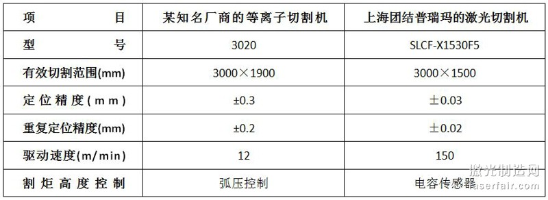 正因為等離子的加工精度較低,故機器無須過於追求過高精度。下表為某知名廠商的等離子切割機與激光切割機的技術參數對比。
