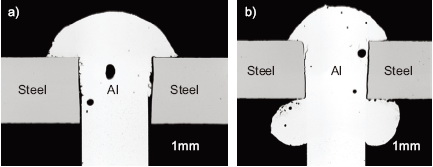 通過優(you) 化長距離激光工藝,可以實現不同形狀的接頭。基本上,能通過調整掃描寬度、掃描速度和激光功率來確保隻熔化鋁材這一麵(圖4a)。此外,單邊激光工藝的優(you) 化還允許雙麵鋁材裝配的塑形(圖4b)。金相分析表明在鋼和鋁之間的邊界地區會(hui) 形成較小的不會(hui) 帶來影響的金屬間化合物相。在與(yu) 強度相關(guan) 的交叉部分(“激光鉚釘頭”)中,沒有檢測到鐵的內(nei) 容物。