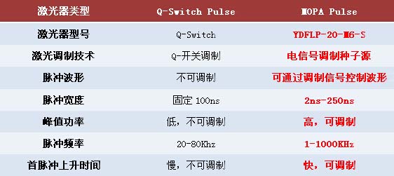 這裏選用市場上比較典型的調Q類型的激光器和深圳市傑普特激光的M6係列MOPA類型激光器的參數作為(wei) 對比: