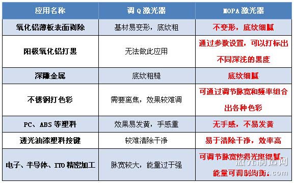 除了以上的幾個(ge) 應用案例外,MOPA激光器與(yu) 調Q激光器還存在很多不同的應用差別,在這裏列舉(ju) 了一部分典型的應用案例,如下表格:
