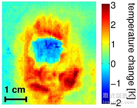 這張紅外照片顯示的是用激光進行冷卻後的氣體(藍色)以及它四周的金屬間(紅色和黃色)的溫度變化。在用一特種激光束進行了30秒的脈衝照射後,與它的容器相比,氣體的溫度下降了幾度。