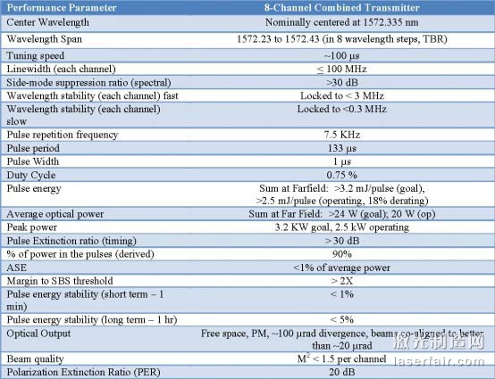 表中概述了激光發射器的光學性能要求,這些要求來源於(yu) 二氧化碳測量和儀(yi) 器結構的科學目標,決(jue) 定采用主振蕩器功率放大器(MOPA)激光構架是因為(wei) 複雜的頻譜要求,決(jue) 定采用摻鉺光纖放大器(EDFA)實現功率放大是因為(wei) 技術成熟度和之前的性能驗證。