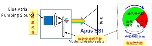 激光熒光粉顯示技術是采用單色激光(即藍光激光)結合含有紅綠等熒光粉的多種顏色旋轉熒光粉色輪技術而產生紅藍綠三基色。