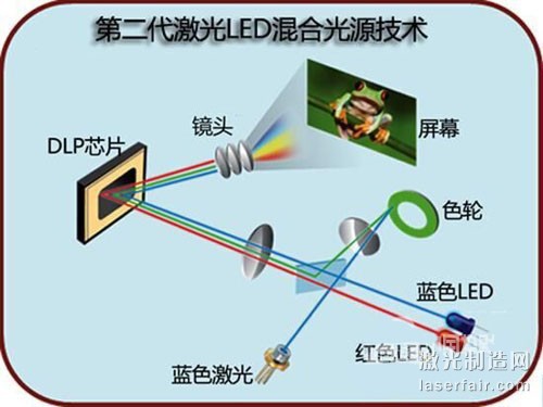 激光+LED混合光源技術是將紅(高亮度紅色LED)、綠(藍色激光通過熒光體轉換為綠色)、藍(藍色激光)三色,通過DLP芯片投影,即可不使用高壓水銀燈泡而實現高亮度投影。相比傳統燈泡來說,其最大的優勢之一就是擁有長壽命。