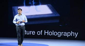 H+Technology首席技術官Dhruv Adhia在騰訊WE大會(hui) 演講 我們(men) 把激光技術進一步推動,有更高的像素,吸引我們(men) 的生活。