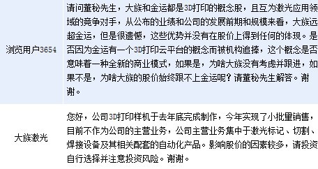 周三大族激光表示,公司3D打印樣機於(yu) 去年底完成製作,今年實現了小批量銷售,目前不作為(wei) 公司的主營業(ye) 務。