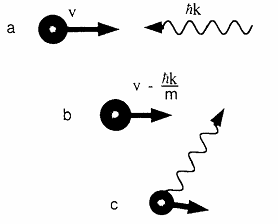 圖1、左圖演示了速度為v的原子與動量為hk的光子相遇後,吸收光子後速度減小了hk/m,然後各向同性釋放光子後原子的總速度比最初降低了。右圖是實驗室拍到的三對激光形成的光學糖漿。