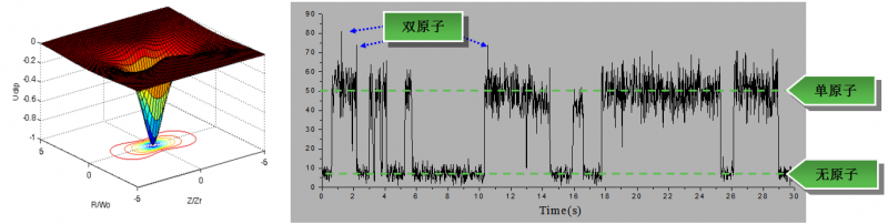 圖2單原子光偶極阱示意圖及阱中單原子信號。